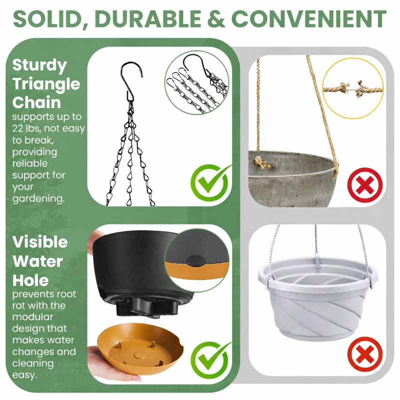 • 【Durable & Eco-Friendly Materials】 Crafted from lightweight, recycled plastic with a wood-like finish. Paired with a rust-resistant triple hook chain for added stability, each pot holds up to 33 lbs (15 kg)—ideal for maximizing vertical planting.