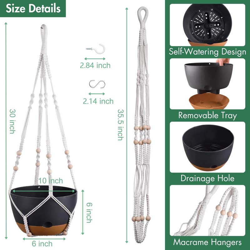 Diigabo Modern Hanging Planter Set adds a clean, stylish touch to any indoor or outdoor space while keeping plants out of reach from pets. Hang it from the ceiling or place it on a tabletop—perfect for patios, balconies, living rooms, kitchens, and small apartments. Each self-watering pot uses a built-in cotton wick to draw water from the bottom reservoir, keeping soil evenly moist for up to 2 weeks and reducing the need for daily watering. The handmade macrame hangers are made from 100% natural cotton rope, tightly braided for strong, stable support, and designed with an open weave to improve airflow around the pot. Matte-finish pots are stain-resistant, easy to wipe clean, and blend well with modern, boho, Scandinavian, farmhouse, or minimalist décor. Ideal for ivy, ferns, herbs, succulents, pothos, spider plants, and more. Package includes 2 self-watering plant pots, 2 water storage trays, 2 macrame hangers, 2 S-shaped hooks, and 2 ceiling hooks (plants not included).