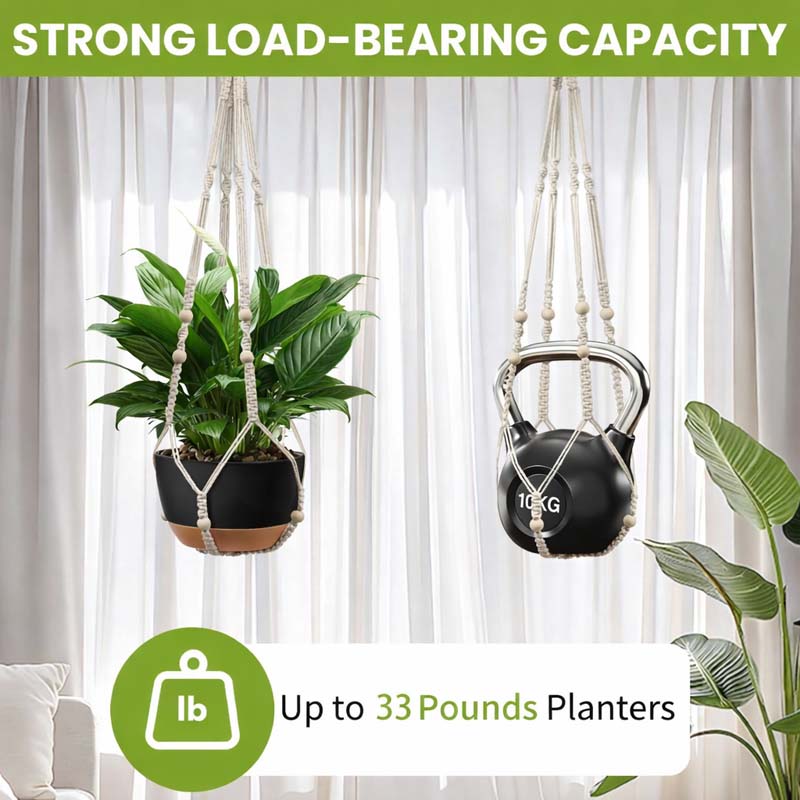 - 【Handwoven Macrame Plant Hanger】 Beautifully crafted from sturdy natural cotton rope and accented with wooden beads, this handwoven macrame plant hanger blends durability with modern boho style. It adds warmth, texture, and visual interest to any space—perfect for elevating living rooms, balconies, patios, porches, or garden areas.