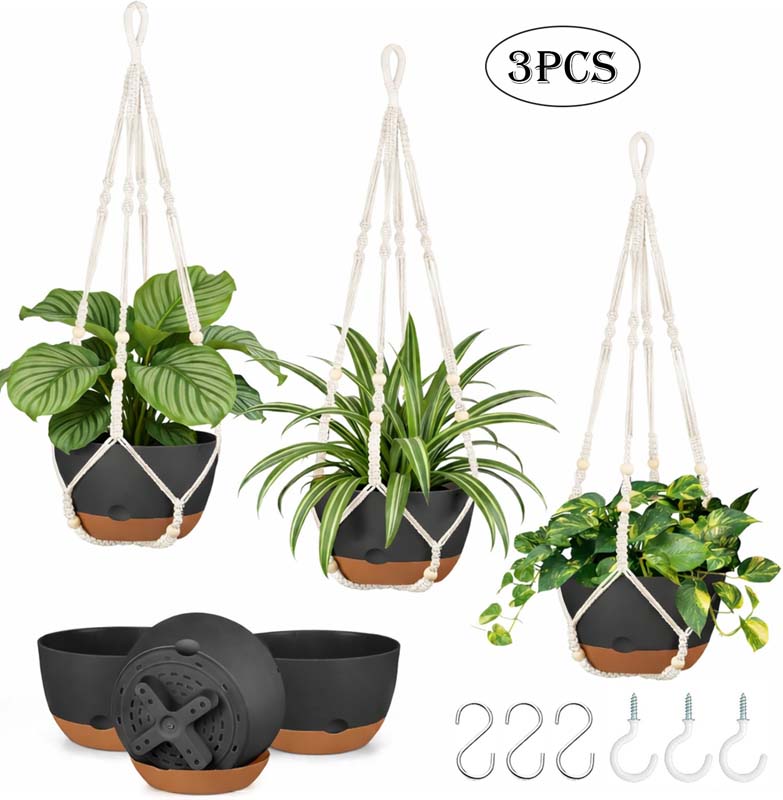 Diigabo 3-Pack 8-inch Self-Watering Hanging Planters with Macrame Hanger Indoor Plastic Plant Pots with Drainage Hole&Saucers Flower Baskets for Outdoor Garden Home Ceiling Decor(Black)Diigabo 3-Pack 8-inch Self-Watering Hanging Planters with Macrame Hanger Indoor Plastic Plant Pots with Drainage Hole&Saucers Flower Baskets for Outdoor Garden Home Ceiling Decor(Black)